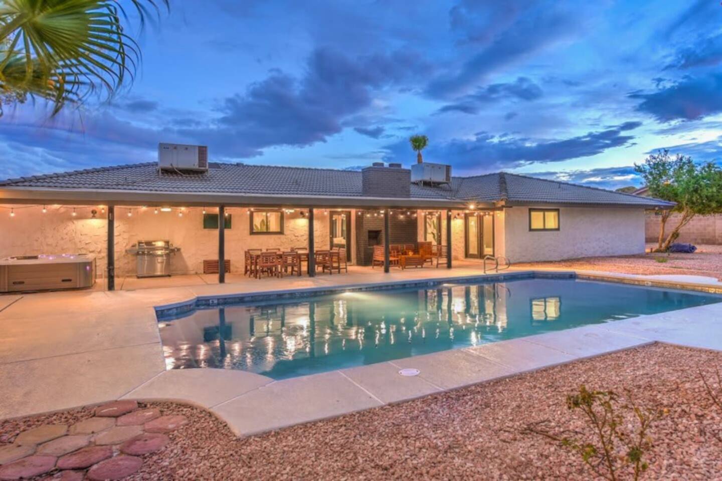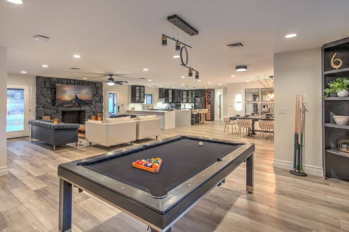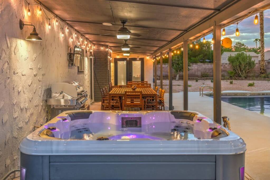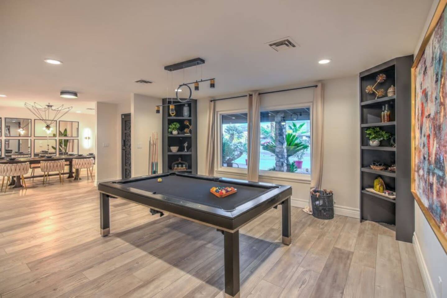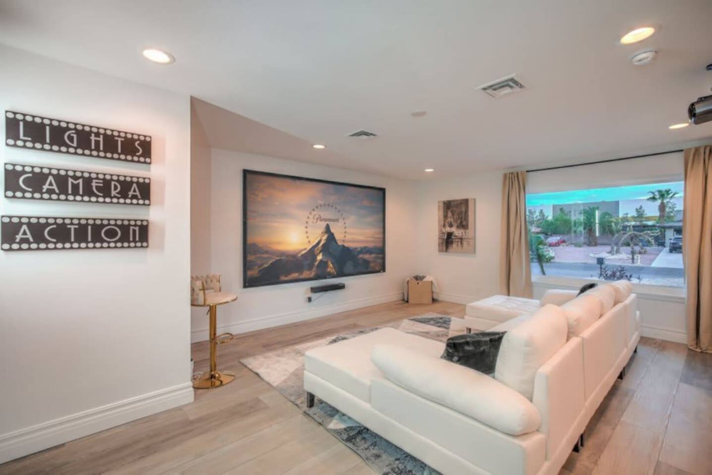 Welcome to 3322 West Mardon in Las Vegas! This short-term rental is a modern retreat boasting 4,016 sq feet of luxury living space. The interior features an open island kitchen, dining area, billiards area, and a movie theater for your entertainment needs. With 5 individual bedrooms and 4 bathrooms inside, plus an outdoor full bathroom, privacy and convenience are key. Enjoy the private sauna, modern swimming pool, year-round above ground jacuzzi/hot tub, and the brand new pool surfacing completed in July 2023. Additionally, the property offers EV charging, making it a perfect choice for eco-conscious travelers. Located less than 10 minutes from the Las Vegas Strip and Airport, this residence combines style, sophistication, and convenience for an unforgettable stay.