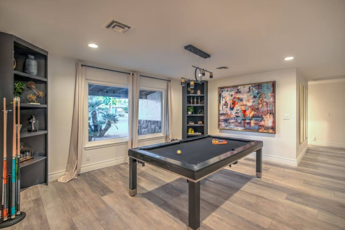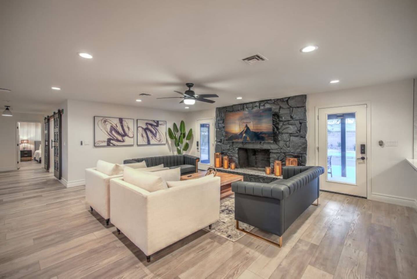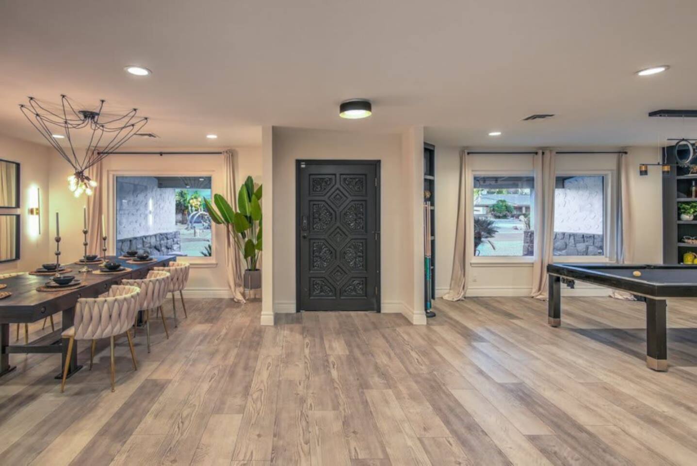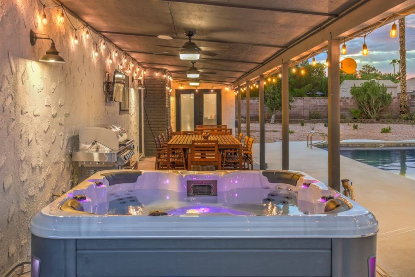 Welcome to 3322 West Mardon in Las Vegas! This short-term rental is a modern retreat boasting 4,016 sq feet of luxury living space. The interior features an open island kitchen, dining area, billiards area, and a movie theater for your entertainment needs. With 5 individual bedrooms and 4 bathrooms inside, plus an outdoor full bathroom, privacy and convenience are key. Enjoy the private sauna, modern swimming pool, year-round above ground jacuzzi/hot tub, and the brand new pool surfacing completed in July 2023. Additionally, the property offers EV charging, making it a perfect choice for eco-conscious travelers. Located less than 10 minutes from the Las Vegas Strip and Airport, this residence combines style, sophistication, and convenience for an unforgettable stay.